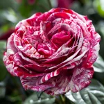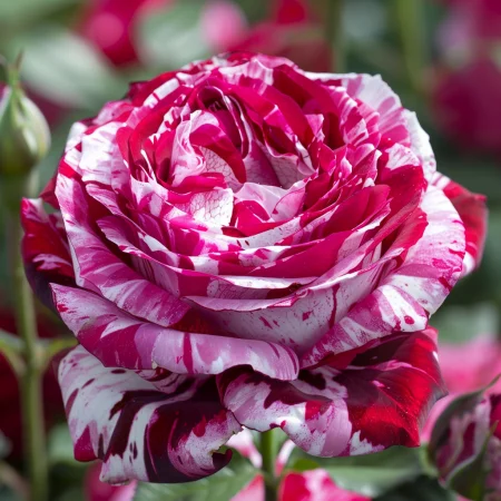 Vyniká velkými, silně vonnými květy v růžovo-červené barvě s nepravidelnými bílými pruhy. Kvete bohatě a opakovaně během sezóny. Keř je energický, dosahuje výšky kolem 1,5–2 m, s dobře olistěnými stonky a dobrou odolností. Vhodný jak do zahrad, tak na řezané květy.