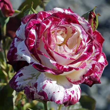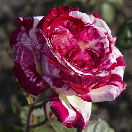 Floribunda s velkými krémovými květy, pruhovanými fialovo-červeně. Kvetoucí opakovaně od května do října, aromatická, odolná vůči chorobám, keř do 90 cm. Vhodná do zahrad, záhonů a kytic.